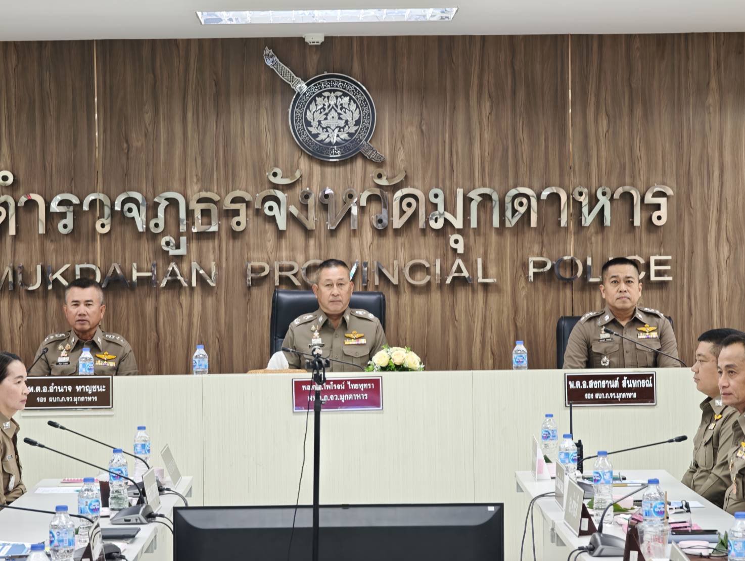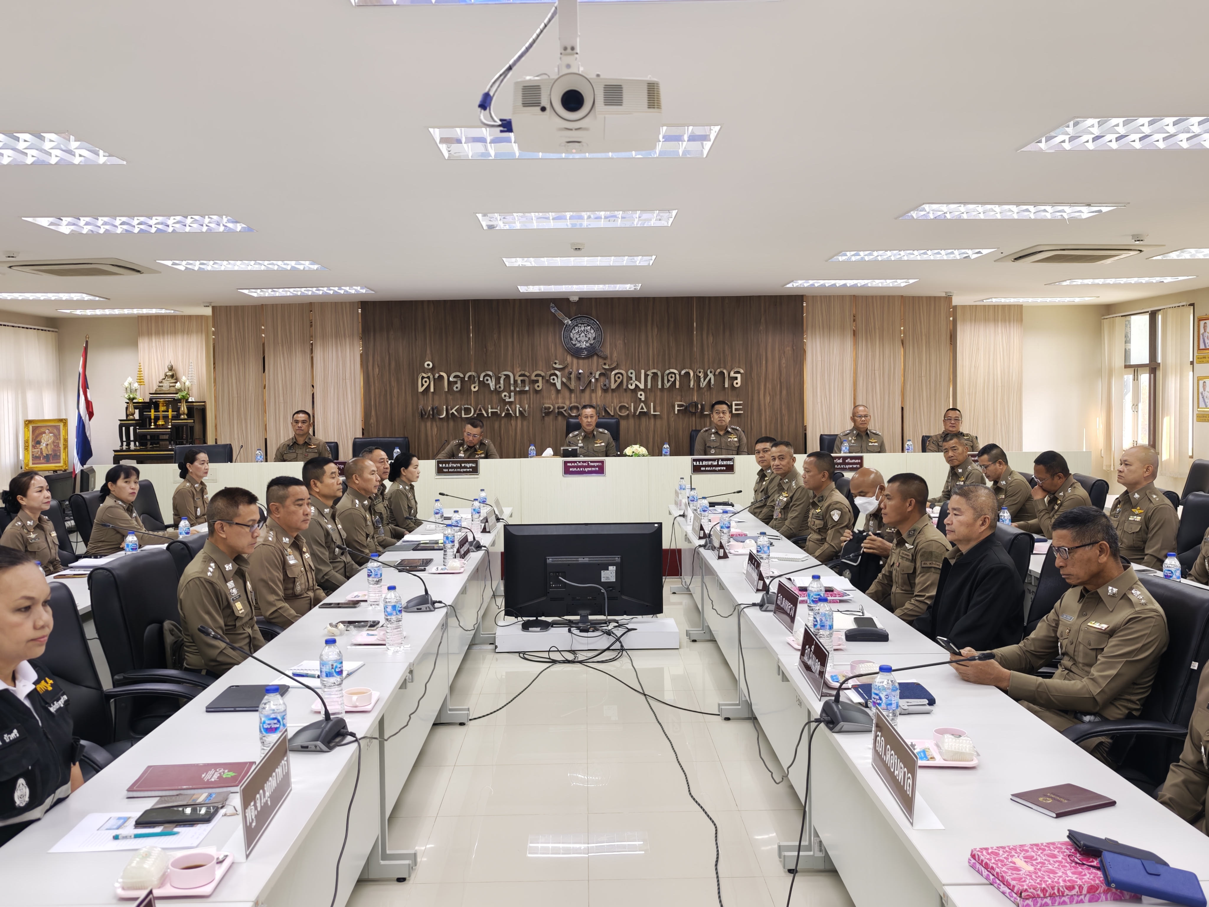 พล.ต.ต.ไพโรจน์ ไทยพุทรา ผบก.ภ.จว.มุกดาหาร พร้อมด้วย พ.ต.อ.อำนาจ หาญชนะ รอง ผบก.ฯ, พ.ต.อ. ธานินทร์ อินทรพรต รอง ผบก.ภ.จว. มุกดาหาร และเจ้าหน้าที่ที่เกี่ยวข้อง ประชุมขับเคลื่อนนโยบาย นายกรัฐมนตรี ปฏิบัติการสกัดกั้นและปราบปรามยาเสพติดตามแนวชายแดน “seal stop safe” ภ.จว.มุกดาหาร มุกดาหาร 3 อำเภอ 7 สถานี ณ ห้องแสงสิงแก้ว